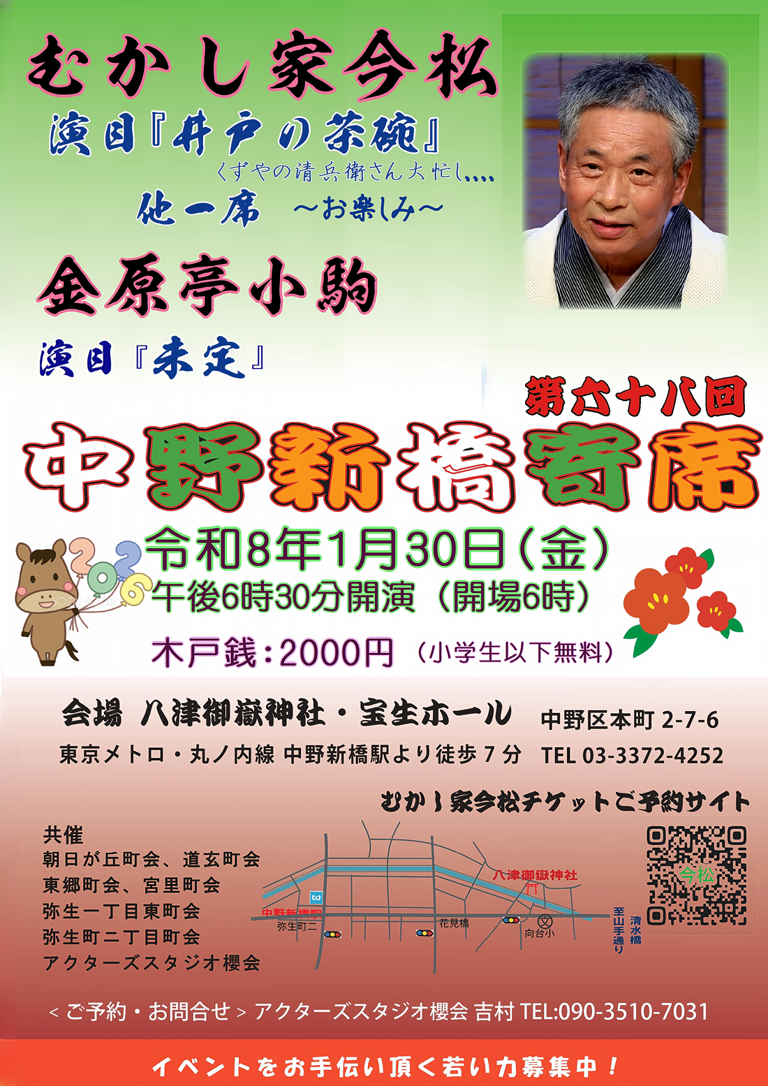 | 2025年 11月28日(金)18:30~ | 第67回中野新橋寄席 場所:八津御嶽神社 東京メトロ丸の内線 「中野新橋」下車6分 |