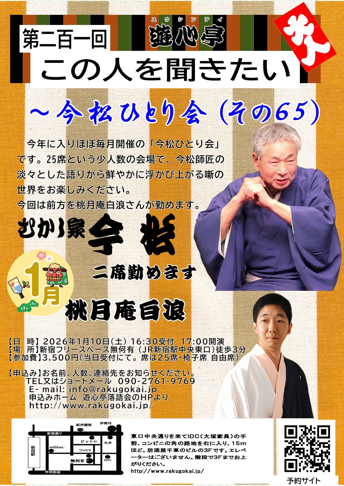 | 2026年 01月10(土)17:00~ | この人を聞きたい(第201回) 今松ひとり会 65 新宿 無何有(むかう) (新宿東南口 徒歩3分) |